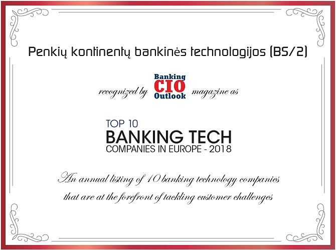 Tarptautinis žurnalas „Banking CIO outlook“ paskelbė įmonių grupei „Penki kontinentai“ priklausančią bendrovę „Penkių kontinentų bankinės technologijos“ (BS/2) viena iš dešimties geriausių 2018-ųjų Europos bankinių technologijų bendrovių.