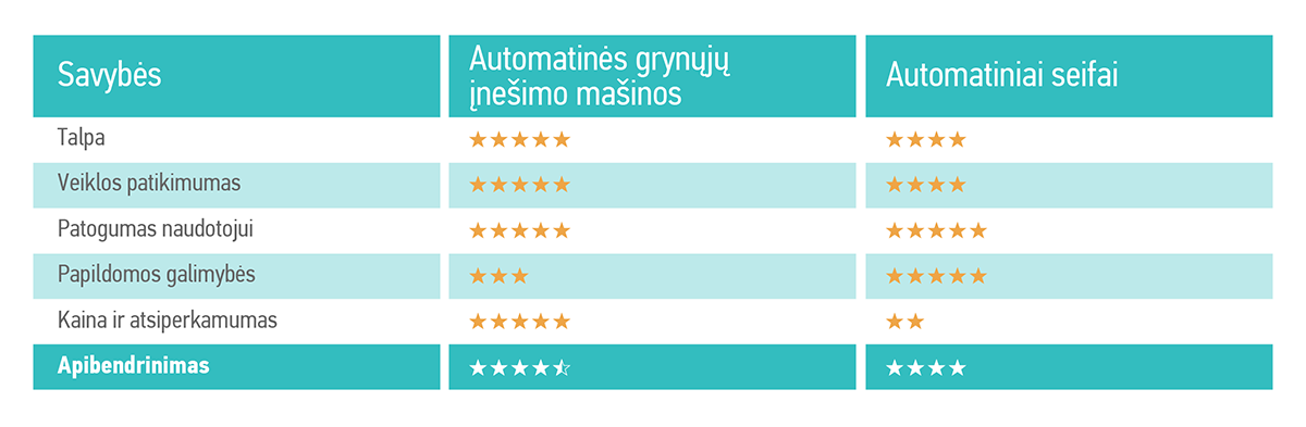Be jokios abejonės, automatinės grynųjų įnešimo mašinos šiuo atveju yra gerokai pranašesnės, nes kainuoja du ar net tris kartus mažiau nei panašios klasės automatiniai seifai. Abiejų įrenginių naudojimo ciklas panašus (7–9 metai), todėl investicijos į jas atsiperka greičiau.