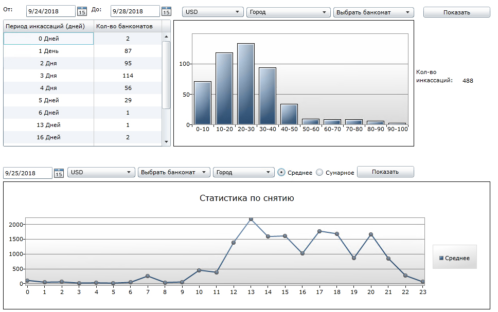 Сверху слева: Сегментация банкоматов по периодам инкассаций; Сверху справа: График распределения возвратов; Снизу: Суточная статистика по снятию наличных